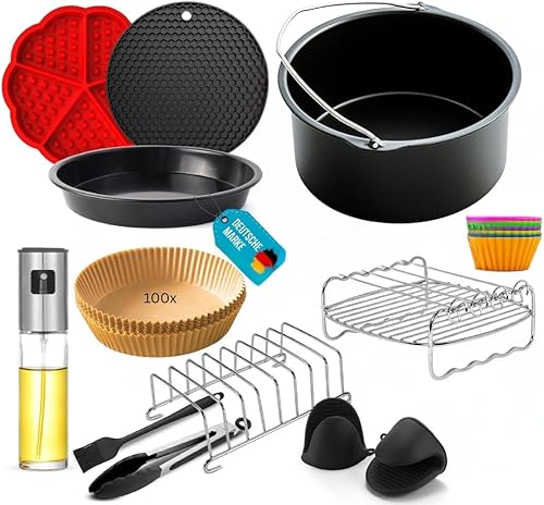 FryChef® Accessoires pour friteuse à air chaud, accessoires pour friteuse à air chaud, 18 pièces, avec moule, 100 papiers sulfurisés, pulvérisateurs d'huile, etc. Compatible avec Cosori, Philips 7,3 l