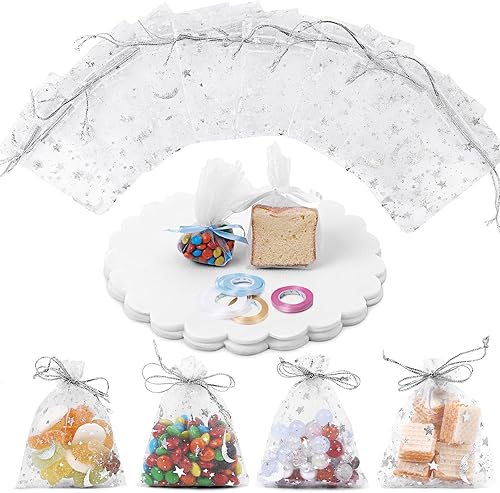 Giloty Sachet Organza Blanc 200 Pièces, 7 x 9 cm, Sac en Tulle Rond Blanc avec 4 Rouleaux de Ruban pour Bonbons, Bijoux, Lavande, Faveur de Mariage