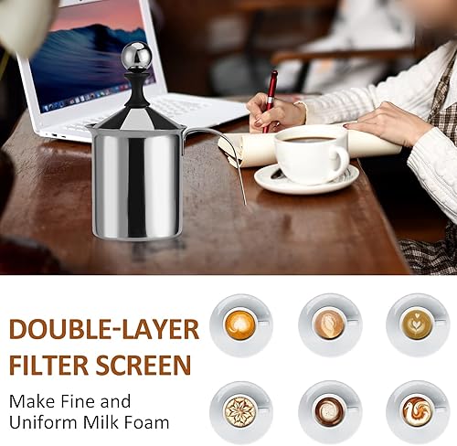 Mousseur à Lait Manuel Inox, 800ml Mousseur à Lait Double Maille Mousse Mélangeur pour Café Latte Chocolat Chaud Cappuccino Kitchen Restaurant Cafe