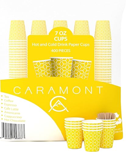 Caramont,7 Oz 400 Gobelets en Carton avec Agitateurs en Bois,Écologique et Jetables,Résistant à la Chaleur,pour la Boisson Froide et Chaude en Carton de Qualité,Ideal pour Café,Thé,Anniversaire,etc.