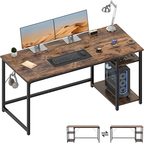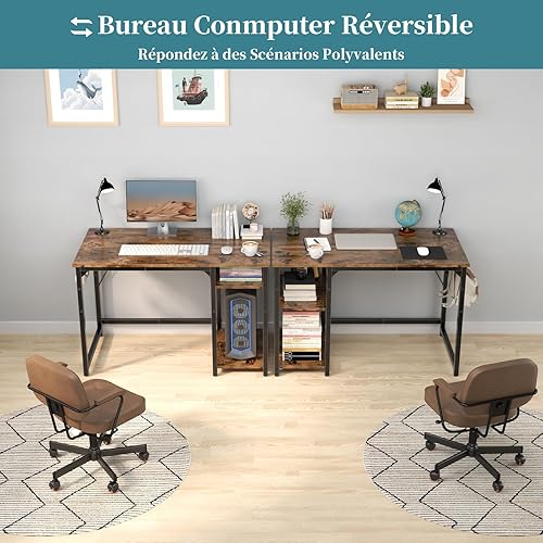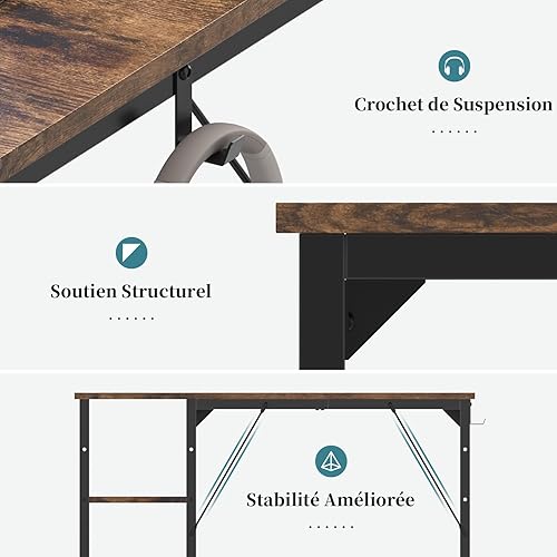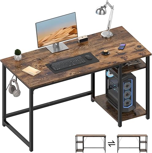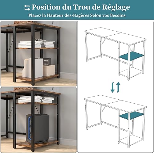 Airfish Bureau avec Rangement 120cm avec 2 Étagères Réglable, Bureau Informatique pour Télétravail Réversible à Gauche et à Droite, Cadre en Acier, Postes de Travail pour Domicile, Marron Rustique