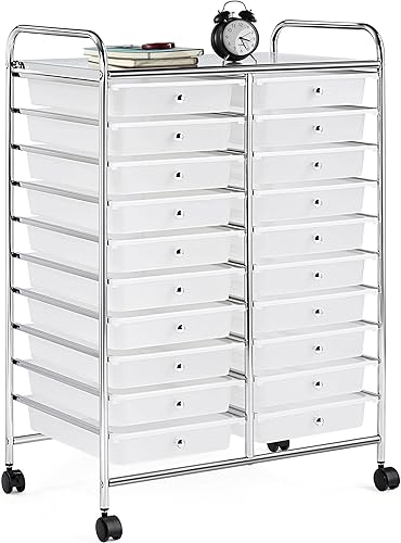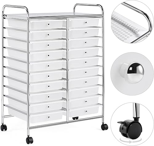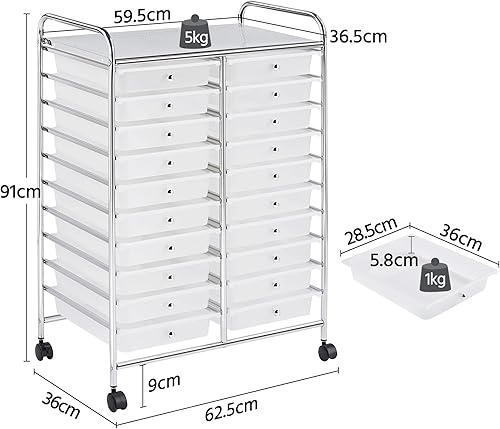 Yaheetech Chariot de Rangement avec 20 Tiroirs Blanc Tour/Meuble de Rangement à roulettes pour Salle de Bain Bureau Cuisine Salon de Beauté 62,5 x 36 x 91 cm