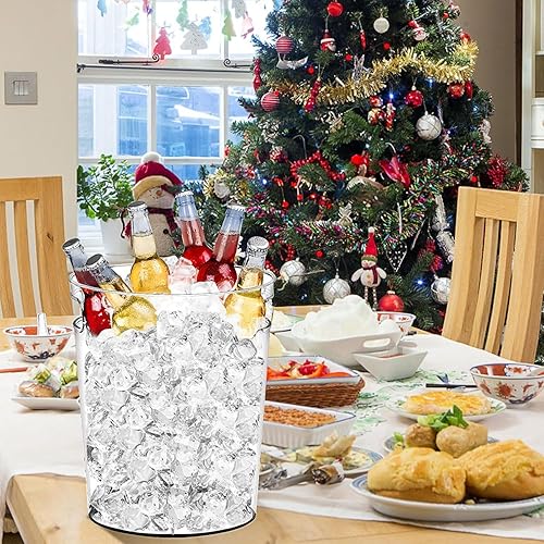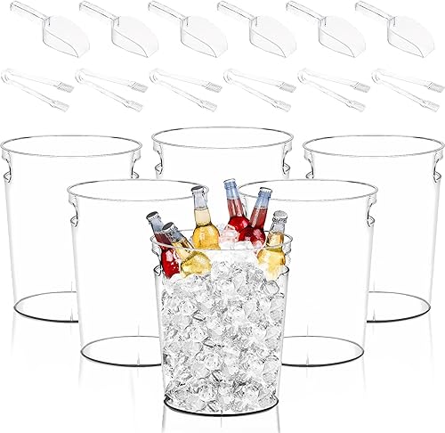 Lot de 6 seaux à glace en plastique transparent pour fêtes avec pelle à glace utilitaire en plastique - Pince de service - Grand seau à vin - Seau à champagne rond avec poignées (4 l)