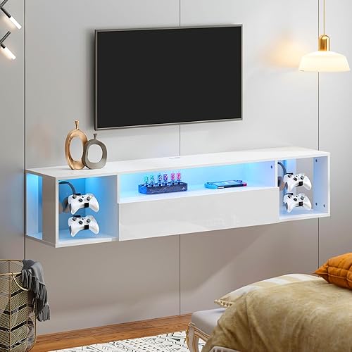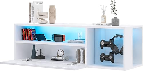 SogesHome Meuble TV Mural LED Console Murale Flottante avec 4 Compartiments Support TV Suspendu Moderne Centre de Divertissement avec Éclairage LED Rangement pour Consoles et Accessoires