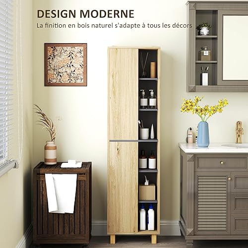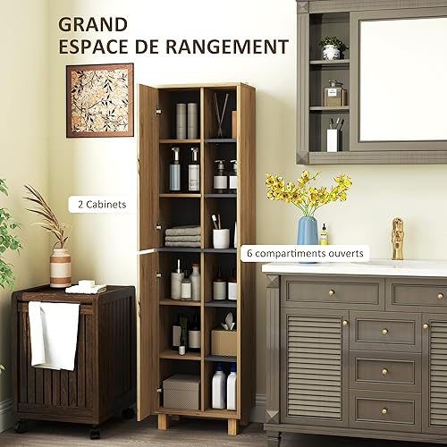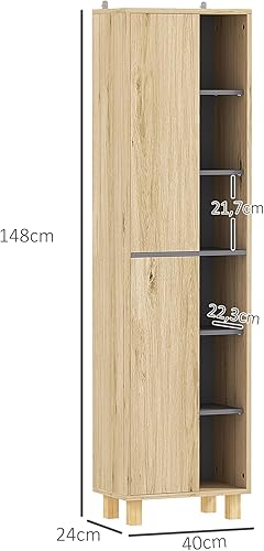 HOMCOM Meuble Colonne Salle de Bain, Armoire de Salle de Bain avec 6 Compartiments Ouverts et 2 placards, dim. 40l x 24P x 148H cm, Bois Naturel