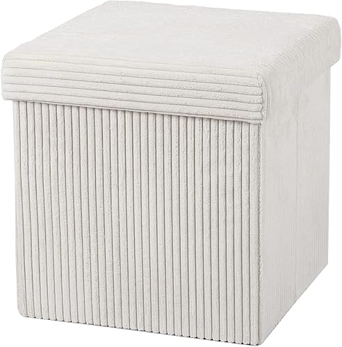 Grand pouf ottoman pliable avec coffre de rangement pour couvertures, jouets, banc en velours côtelé (blanc, 38 cm x 38 cm)