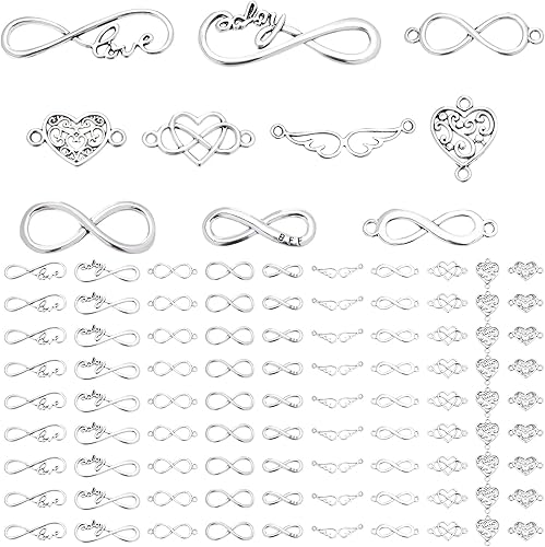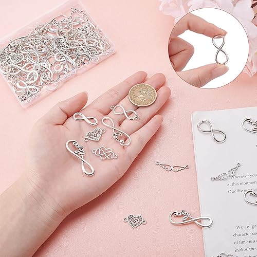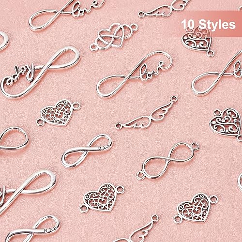 PH PandaHall Connecteurs de bijoux, 100pcs 10 styles Infini/Cœur/Aile Liens en alliage Charmes Amour Bijoux Connecteur Pendentifs pour DIY Bracelets Collier Bijoux Artisanat, Argent Antique