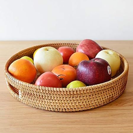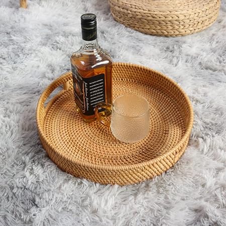Rond Plateau de Service Rotin Tissé avec Poignées Plateau de Table Basse pour Ottoman Décorative Naturel (30cm x 6cm)