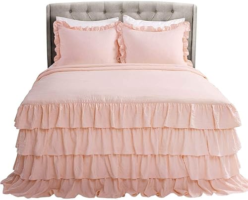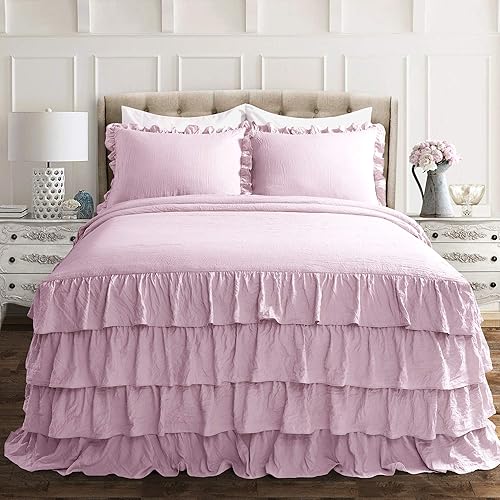 Lush Decor Ella – Couvre-lit Vintage Chic à Volants en Dentelle, Gris Clair, Style Ferme, léger, 3 pièces, très Grand lit, Polyester