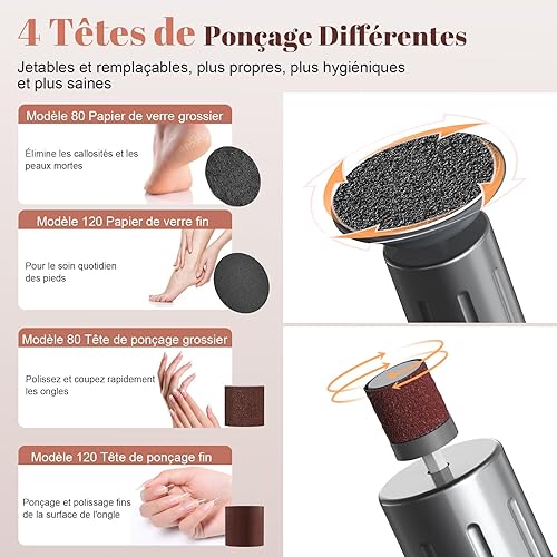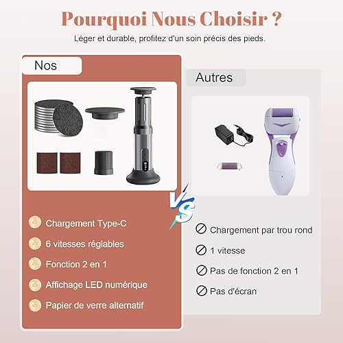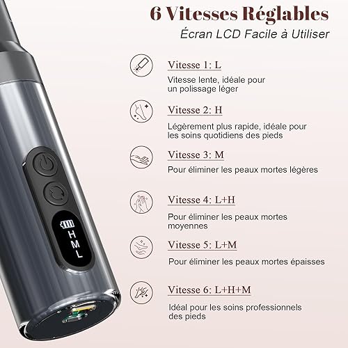 Robofun 2025 Nou Râpe à Pieds Pédicure Electrique avec LED Affichage, 2 en 1 Ensemble Râpe Électrique Pied Professionnel avec Limes à Pieds et Vernis à Ongles, 6 Vitesses, pour Peau Morte Corne Talon