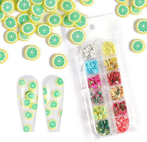 Lot de 12 grilles / boîte de perles d'argile souples aux fruits - Pour l'art des ongles de fruits - Disques en polymère 3D - Moule en résine époxy - Décoration