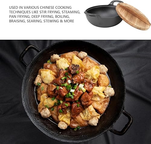 Poêle Wok en Fonte avec 2 Poignées et Couvercle en Bois, Wok Traditionnel Chinois Non Revêtu, Poêle Profonde à Fond Plat pour Cuisinières électriques, à Induction et à Gaz, pour