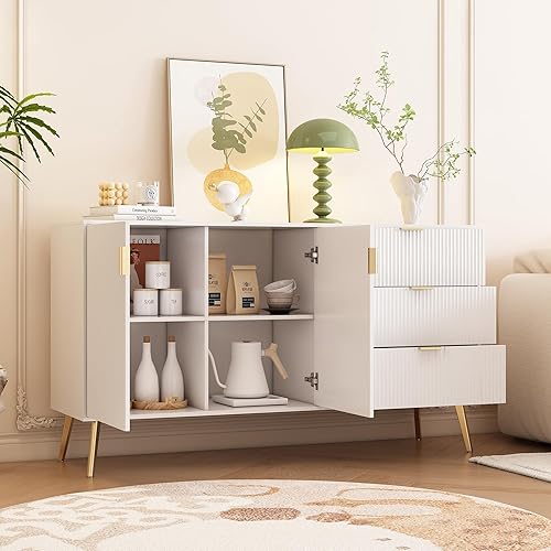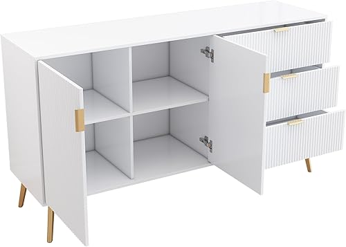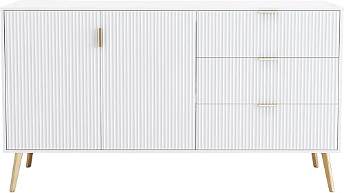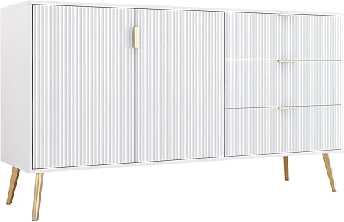 Merax Commode moderne avec pieds et poignées plaqués or, coins arrondis, 7 compartiments, 140 x 40 x 78 cm, blanche, pour chambre à coucher, salon et salle de bain