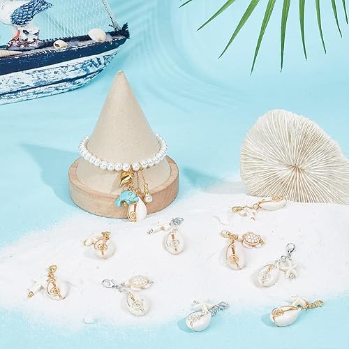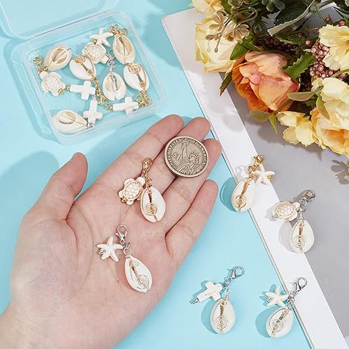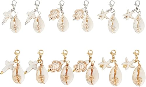 GOMAKERER 12pcs 6 styles Breloques Coquillages, Pendantes Thème de L'Océan avec Fermoir Mousqueton Breloques Coquillage Naturel avec Turquoise Croix Tortue Perle pour la Fabrication de Bijoux DIY