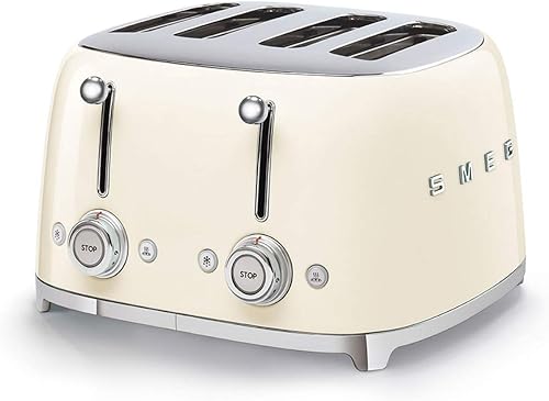 Smeg, Grille-pain 4 Tranches TSF03CREU, 4 Fentes 36 mm, 6 Niveaux de Brunissage, Fonction Chauffage, Décongélation et Bagel, Éjection Automatique du Pain, 2 Ramasse Miettes, 2000 W, Crème