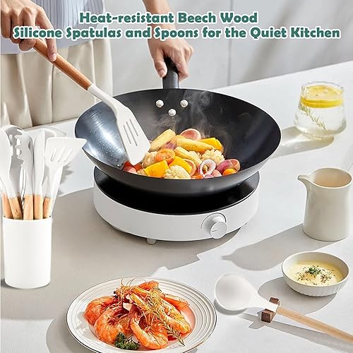 KAIYAYA Ustensiles de Cuisine Silicone 12 Pièces Lot Ustensile Cuisine avec Poignée en Bois Ustensiles Cuisine Antiadhésive Sans BPA passe au Lave-Vaisselle pour Tous Batteries de Cuisine