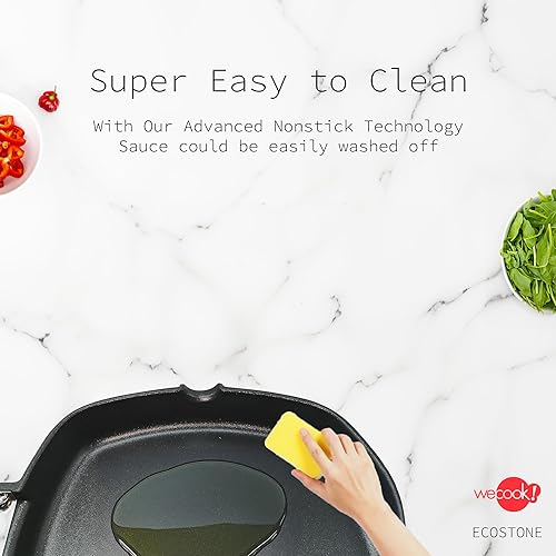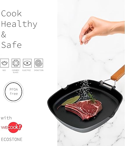 WECOOK! Ecostone Poêle à Griller Induction Lisse, 24 x 24 cm, Antiadhésive ILAG Écologique sans PFOA, Fonte d'Aluminium, Épaisseur 5 mm, Poignée en Bois Pliable, Vitrocéramique, Gaz