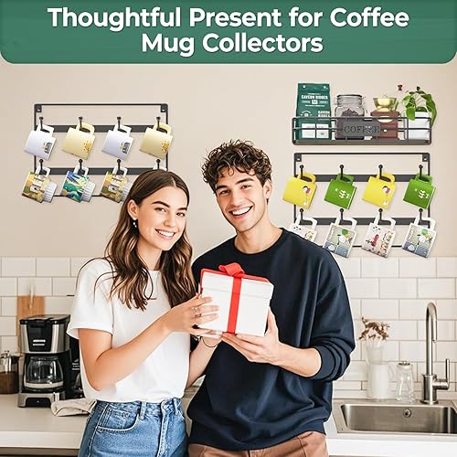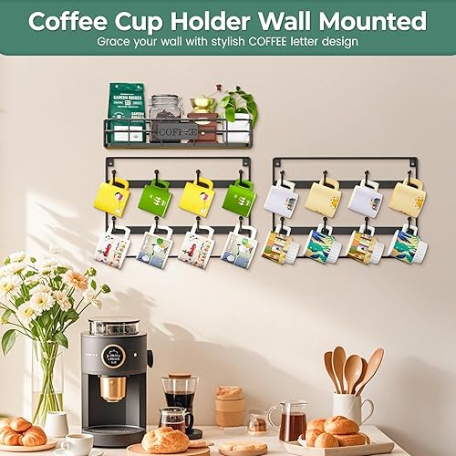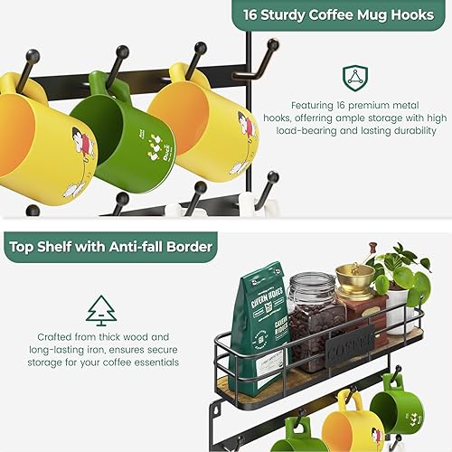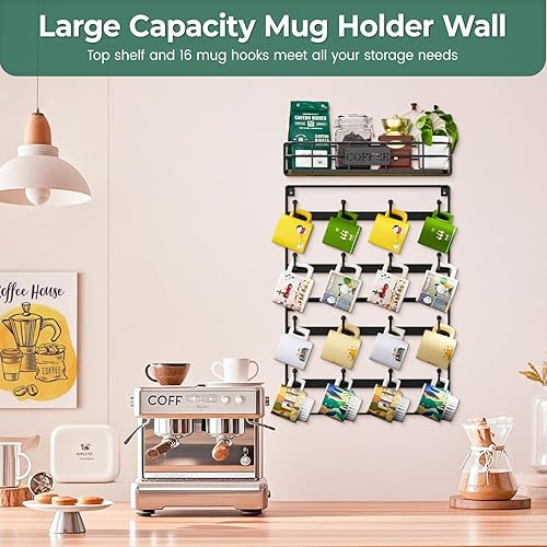 EsLuker.ly Support mural pour tasses avec crochets, support de tasse à café, étagère pour cuisine, café, bar, rangement à suspendre pour 16 tasses, noir