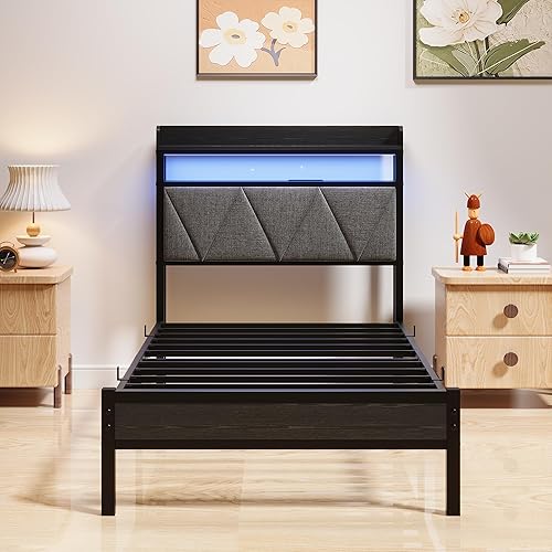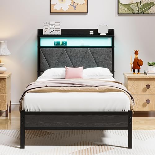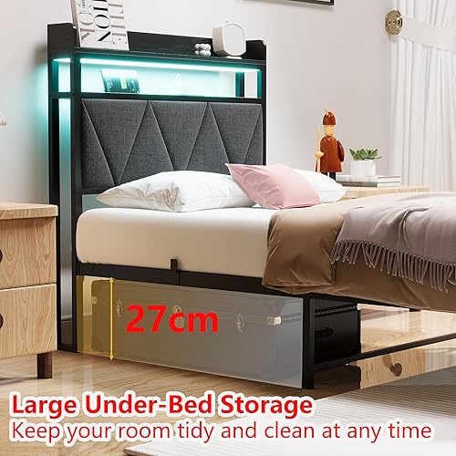 HAHRIR Cadre de lit de 90 x 200 cm avec tête de lit rembourrée en bois avec deux étagères, station de charge, lumières LED, cadre de lit en métal robuste, pas de sommier tapissier nécessaire
