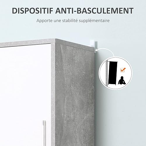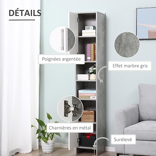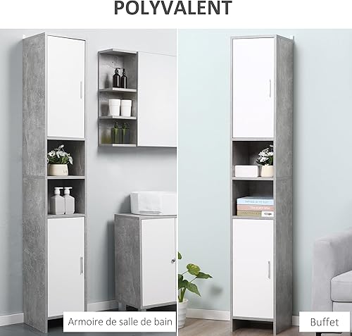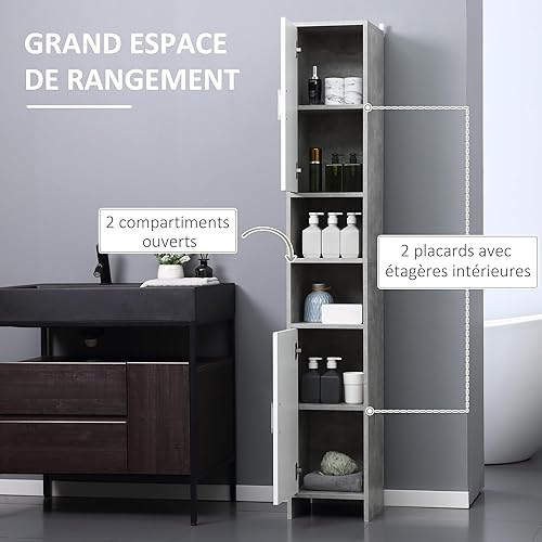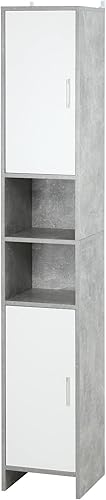 kleankin Meuble Colonne Rangement Salle de Bain dim. 30L x 30l x 180H cm 2 placards avec étagère + 2 niches Panneaux Particules Aspect Ciment Blanc
