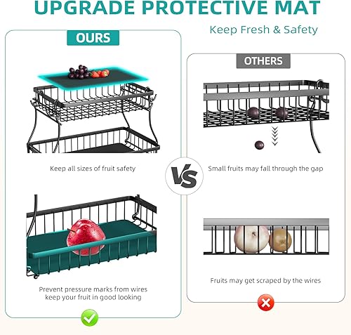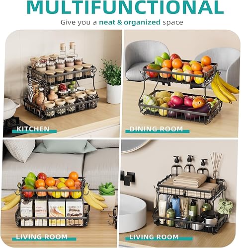 Foensc Corbeille à fruits à 2 niveaux avec 4 crochets de banane, bol à fruits amovible amélioré pour comptoir, panier de rangement en fil métallique de grande capacité, support de fruits pour pain,