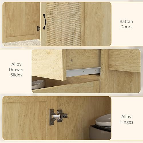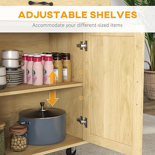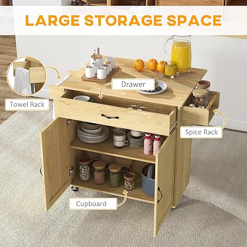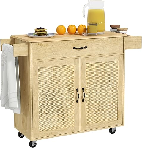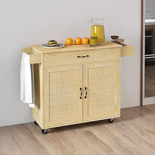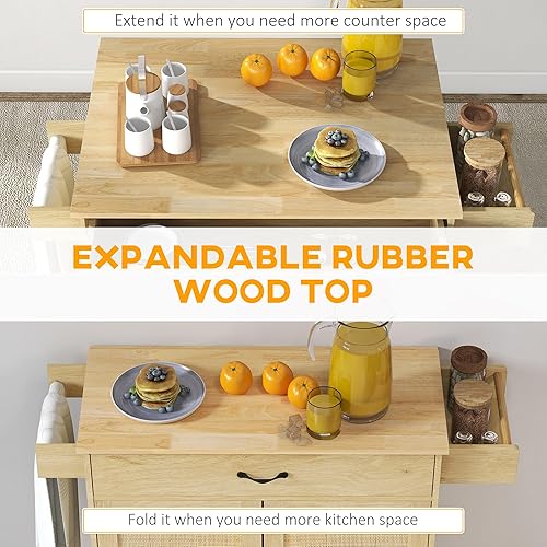 HOMCOM Chariot de cuisine avec plateau pliable, île de cuisine style Boho avec tiroir, armoire et porte-épices en bois et rotin