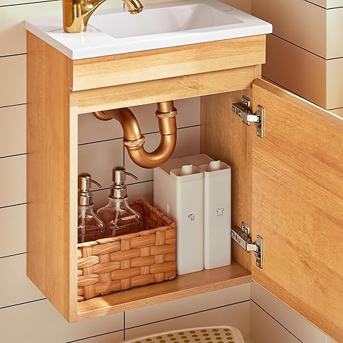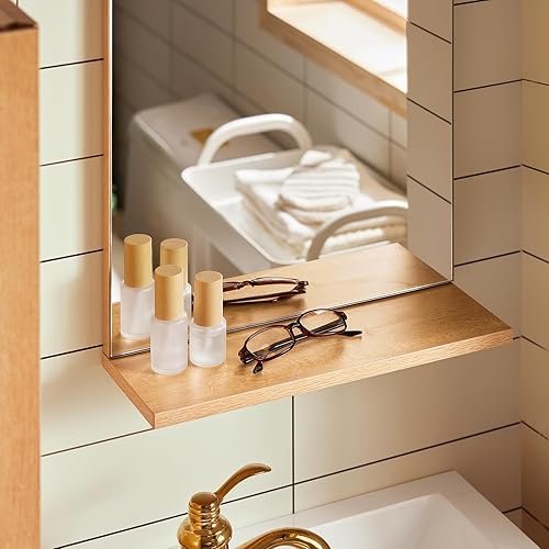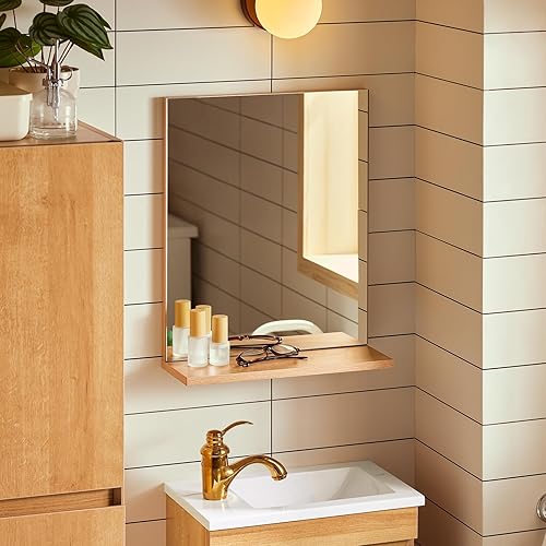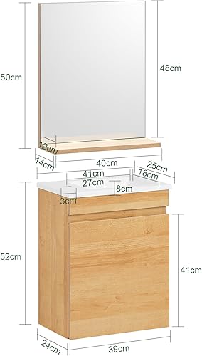 SoBuy 30% de Réduction Meuble Suspendu pour Lavabo avec Miroir Meuble sous Vasque avec Miroir Ensemble de Lavabo en céramique avec Miroir Meuble Lave-Mains avec Miroir, Couleur Bois, BZR169-SET