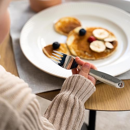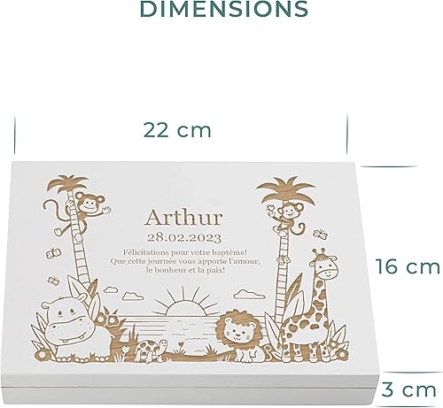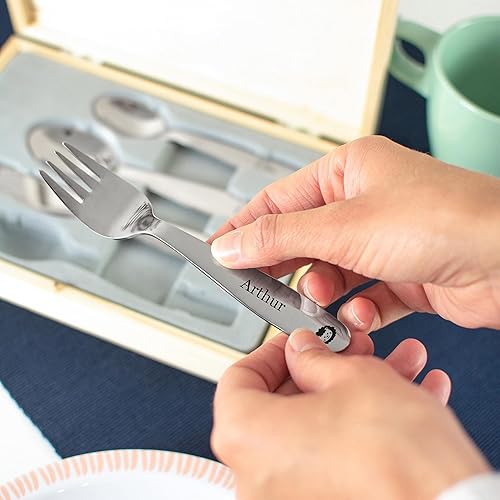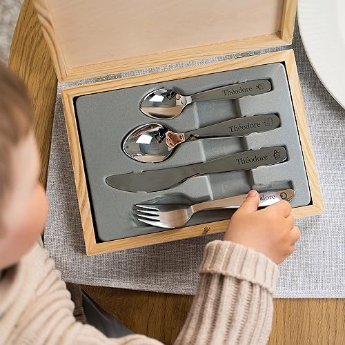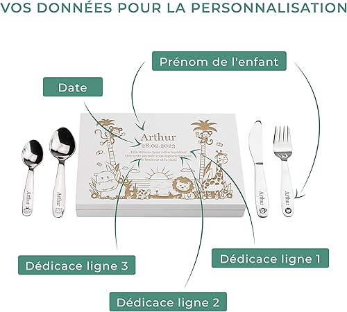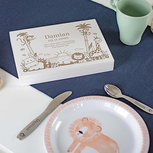 LAUBLUST Couverts personnalisés pour Enfants avec boîte Cadeau personnalisée en Bois - Couverts Enfant INOX - Jungle - 4 pièces - Cadeau personnalisé