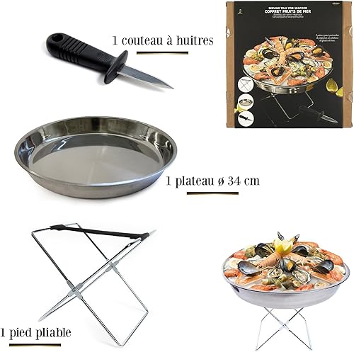 Cook Concept KU6102 Plateau à Fruits de mer avec Support pliable et Couteau à Huîtres Gris et noir Inox D34,4 x H24,2 cm