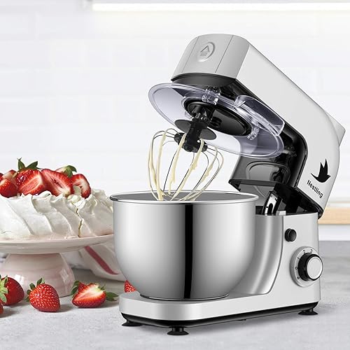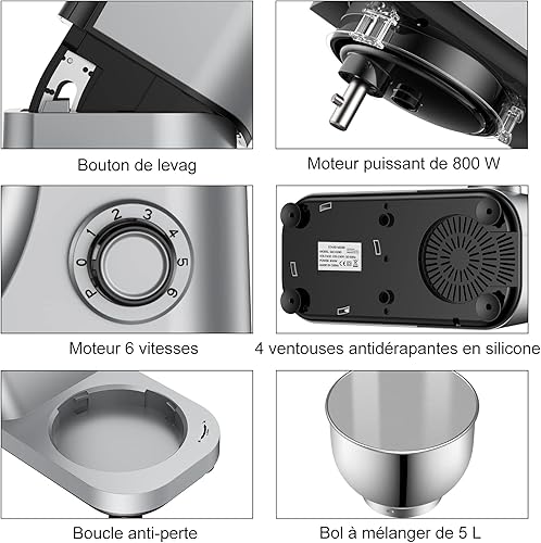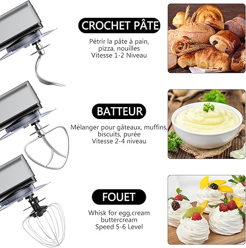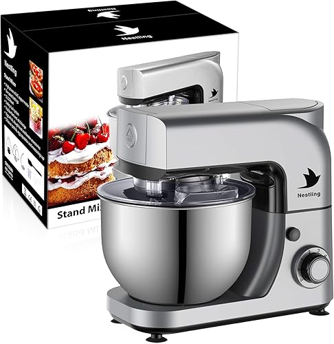 Nestling 5L Robot Pâtissier, Faible Bruit Batteur Électrique, 3 en 1 avec Batteur, Fouet and crochet pétrisseur, 6 Vitesses, avec Bol D'Acier inox Robot Multifonctionne 800W Gris
