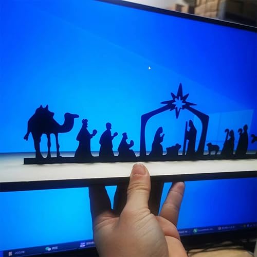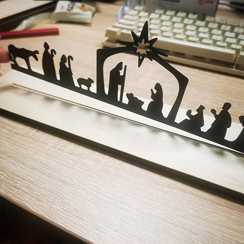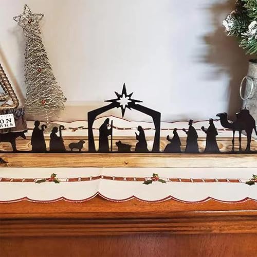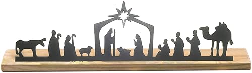 Crèche de Noël avec base en bois, crèche de Noël en métal noir pour petites personnes, crèche de Noël en saule chameau pour étagère, table murale
