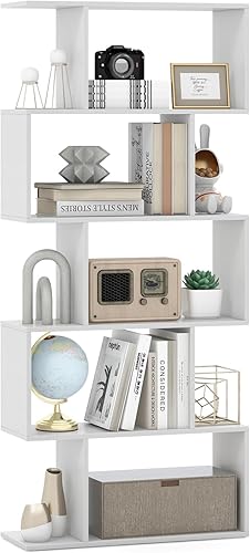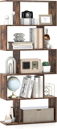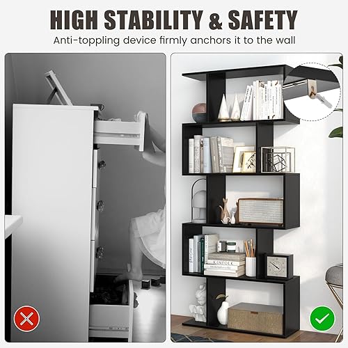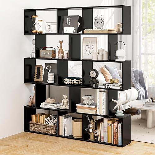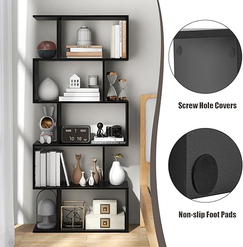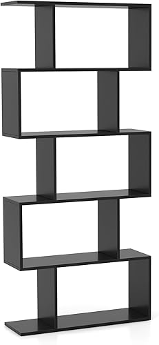 GIANTEX Bibliothèque à 5 niveaux, 70 x 23,5 x 158 cm, séparateur de pièce, en bois, en forme de S, étagère de rangement pour salon, chambre à coucher, bureau (noir)