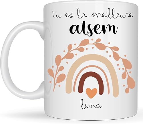 henrietteandco - Mug ATSEM Personnalisé Cadeau Remerciement Original | Tasse Prénom Fin d’Année École Maternelle 330ml Céramique Blanc | Idée Cadeau ATSEM Femme (Arc en Ciel)