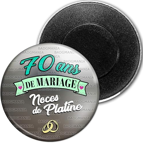 Badgmania Magnet Aimant Frigo 5.9 cm 70 Ans de Mariage Noces de Platine - Anneaux Anniversaire Mariage