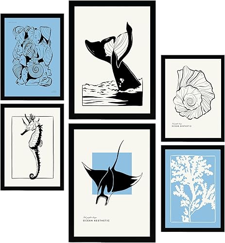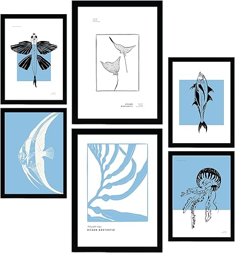 Nacnic Ensemble de 6 affiches à l'encre noire. Coquillages ronds. Impressions artistiques de la mer et de l'océan pour l'aménagement intérieur et la décoration. A3 et A4, sans cadres.