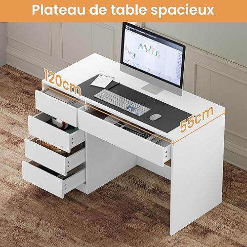 eSituro Coiffeuse avec tiroirs sans Miroir, 120x55 cm, Bureau avec Rangement Tiroir, Bureau Blanc, avec 5 Tiroirs, Table de Bureau, Bureau Informatique, Bureau Ordinateur, Post de Travail