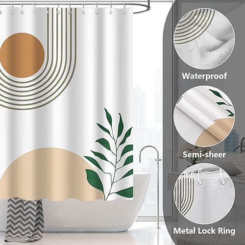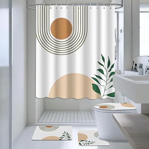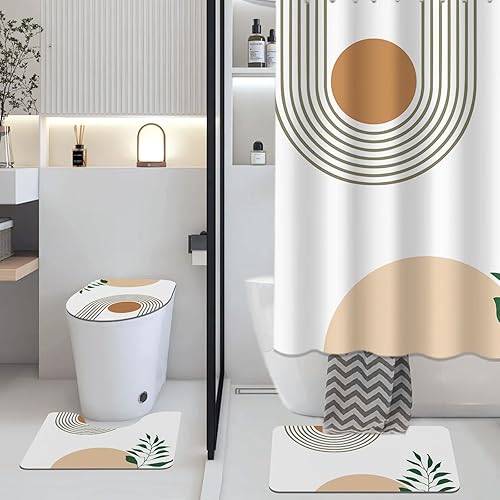 AIBIIN Lot de 4 rideaux de douche abstraits bohèmes avec tapis antidérapant, housse d'abattant de toilette et tapis de bain, rideaux de bain bohème pour décoration de salle de bain avec 12 crochets