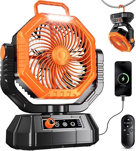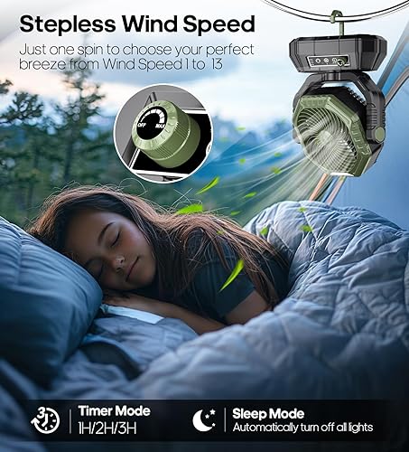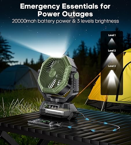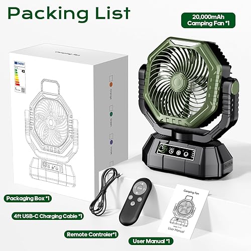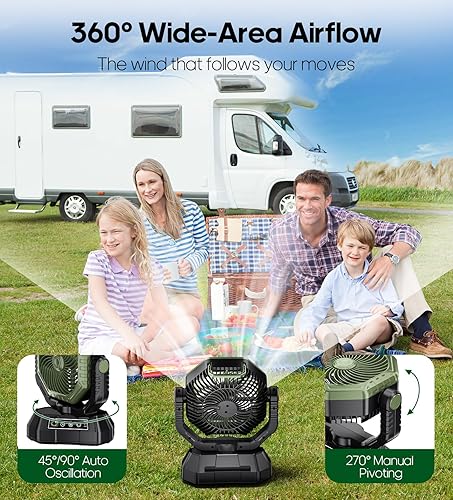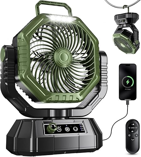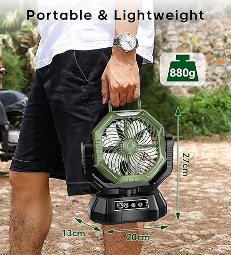 VTHW Ventilateur de Camping avec lanterne LED, 20000mAh Ventilateur Rechargeable Avec Télécommande et Crochet, Rotation 270°, Vitesse Réglable, Mode Minuterie,Pour l'intérieur et l'extérieur (vert)