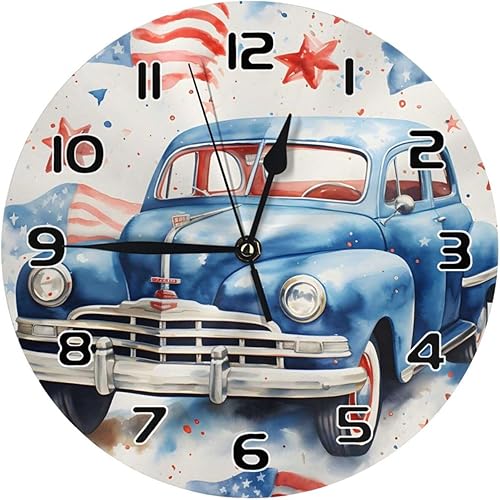 Facile À Lire Horloge Murale 25Cm, Voiture avec Drapeau Américain pour Le Jour De L'Indépendance Horloges Murales Décorative, Moderne Pendule Murale, Café, Déco, Classe