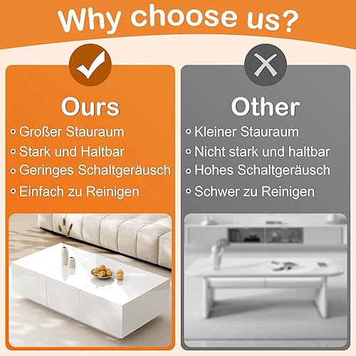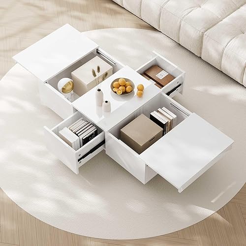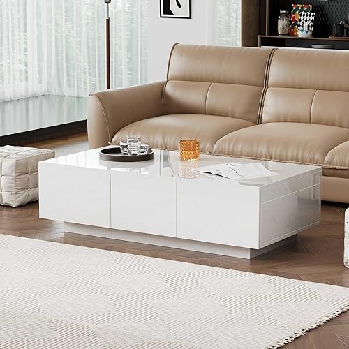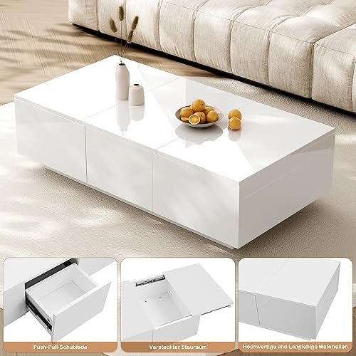 LULUWA Table Basse avec Structure de Rangement Push-Pull, Table de Salon Brillante avec Tiroirs Double Face (Blanc)