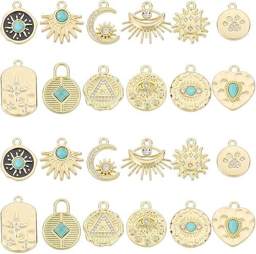 SUNNYCLUE 1 boîte de 24 breloques Turquoise Synthétiques de 12 styles Breloques en Strass Dorés Plaques en Alliage Pendentifs en Pierre Ronde Œil Soleil Lune pour la Fabrication de Bijoux Accessoires