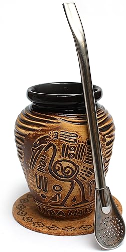 Mate Green Ensemble de calebasse pour maté - Tasse à maté en céramique Aztek 300 ml - Tasse à thé mate en céramique - Paille Bombilla en acier inoxydable de 19 cm - Tampon en liège - Calebasse en