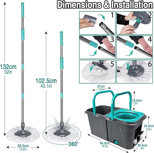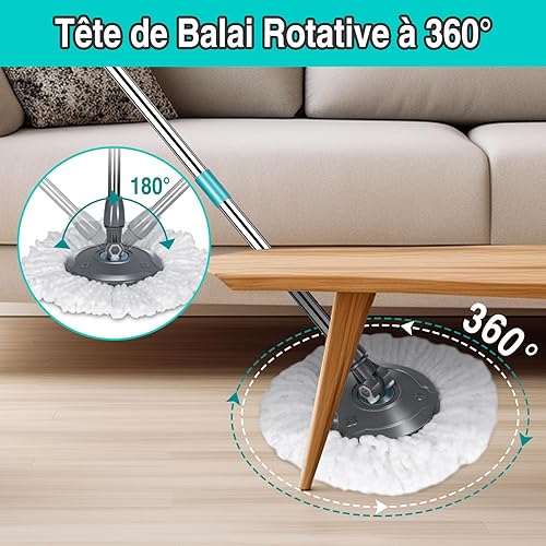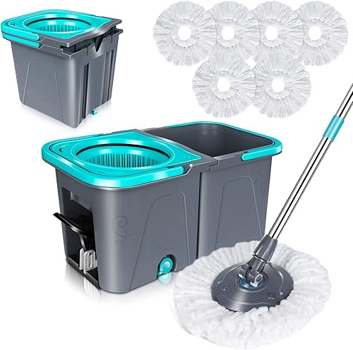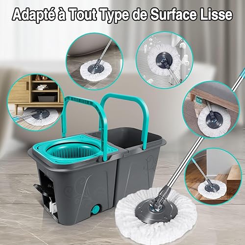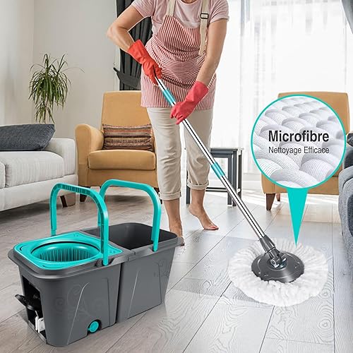 MASTERTOP Balai à Franges et Seau Essoreur à Pédale, Seau Empilable de 2 Bacs à l'eau Sale Séparée, Serpillière Rotative 360° avec Manche Téléscopique et 6 Tampons Microfibre