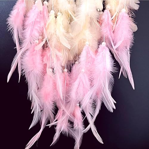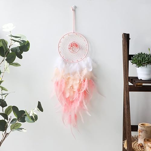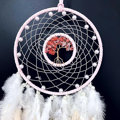 JZK Pierres de Cristal Tree of Life Arbre de Vie Attrape-rêves Plumes Roses Blanches avec Perles pour Anniversaire de Femmes Filles décoration Chambre Enfants bébé, Ornement Mural, Cadeau Mariage