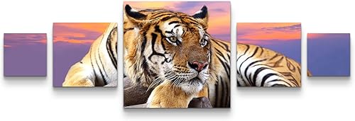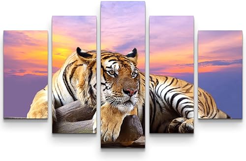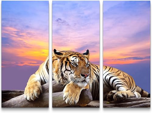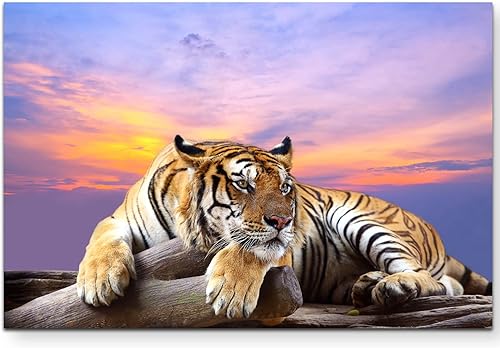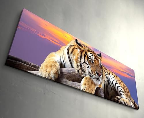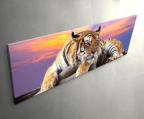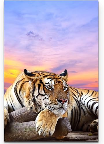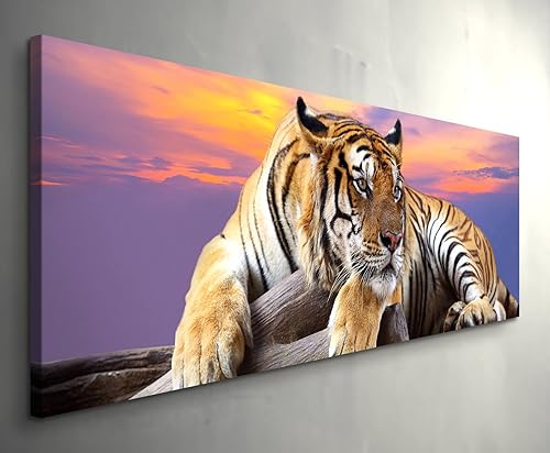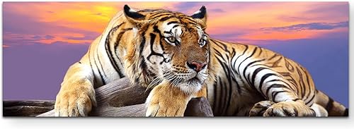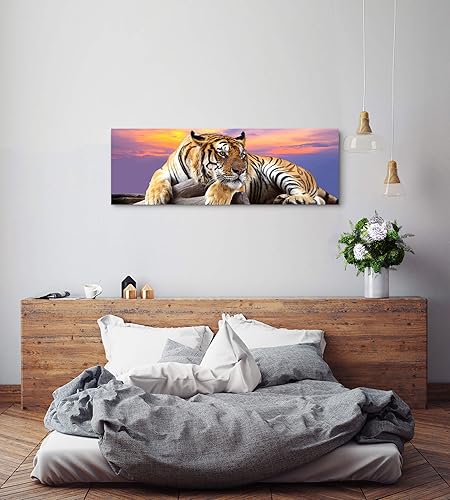 Paul Sinus Art Tableaux sur toile | Images sur toile 120 x 80 cm Tigre couché avec coucher de soleil en arrière-plan