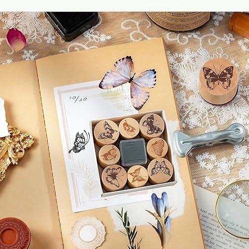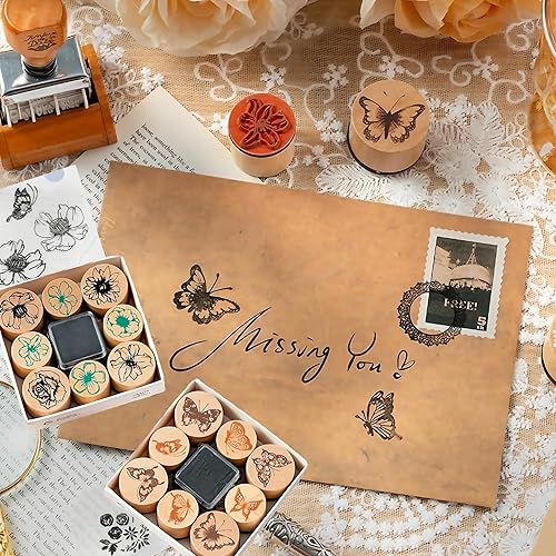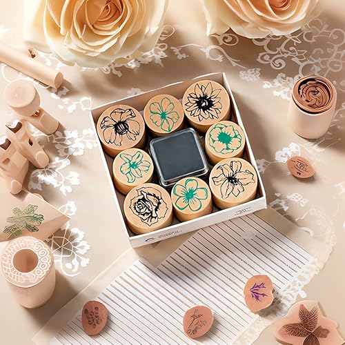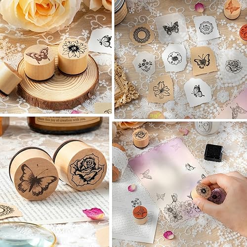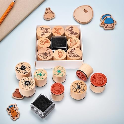 Syrvnto 16pcs Tampon encreur Enfant Rond Tampons en Bois Motifs Fleurs et Papillons Set Créatif Artisanat pour Journaling, DIY Scrapbooking et Carterie Décoration- Encreur Noir Inclus
