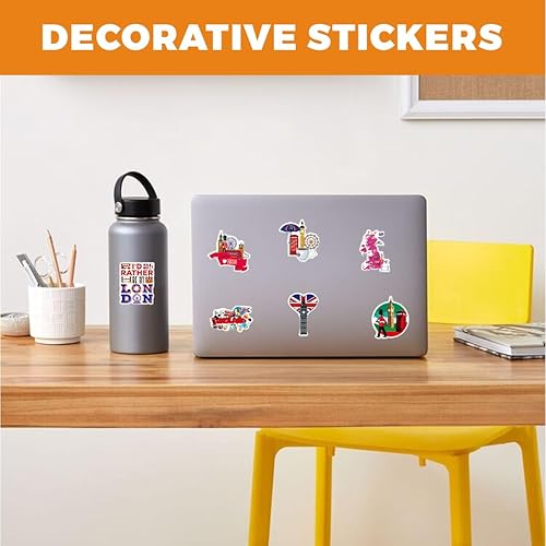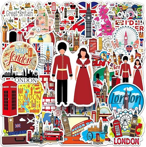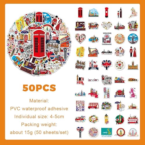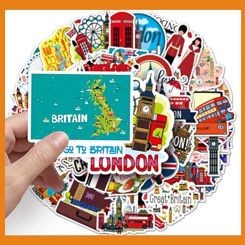 JEYORZY Lot de 50 Angleterre Voyage Autocollants en Vinyle Imperméables, Valises Stickers pour décorer bouteilles d'eau, ordinateurs portables, skateboards et scrapbooking(Voyage)