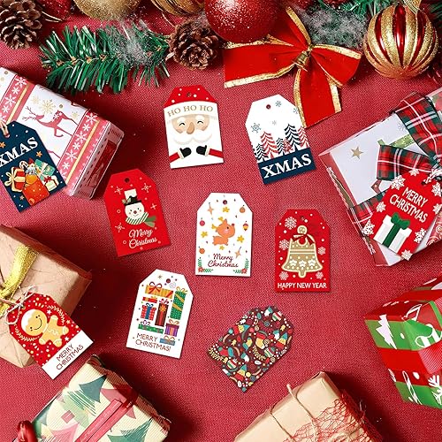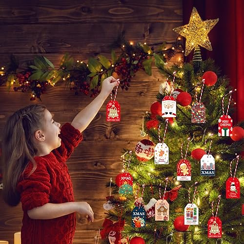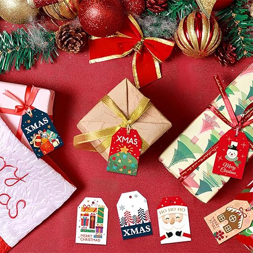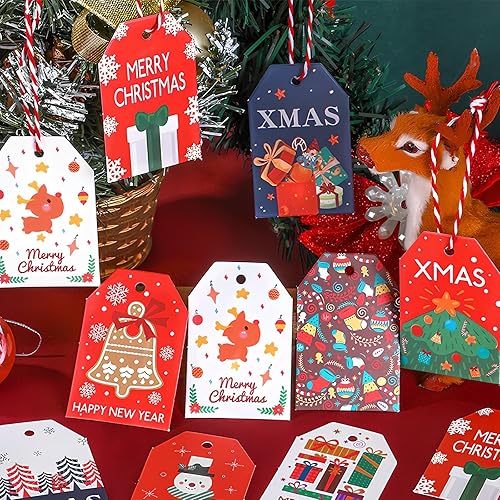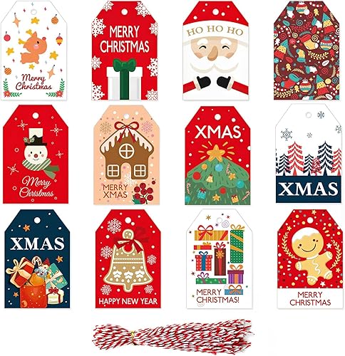 Lunaanda Étiquettes Cadeaux Noël, 48 Pièces Étiquettes Cadeaux Kraft Joyeux Noël à Suspendre avec Ficelles pour Bricolage, Décoration Sapin de Noël, Emballage Cadeaux, 12 Motifs Différents Étiquettes