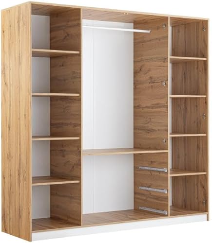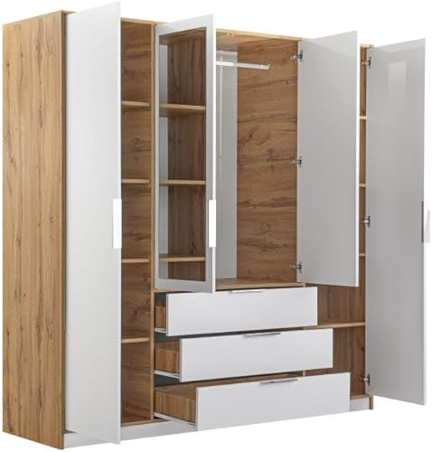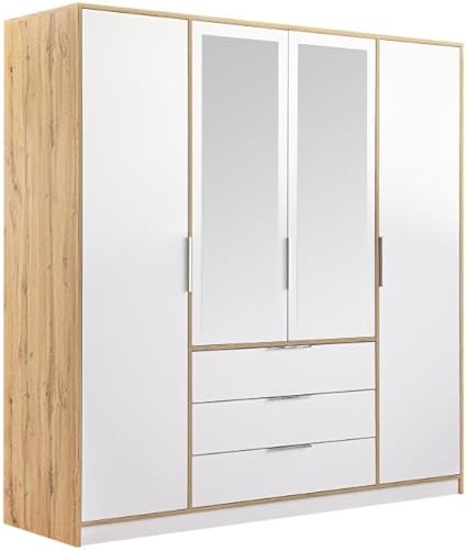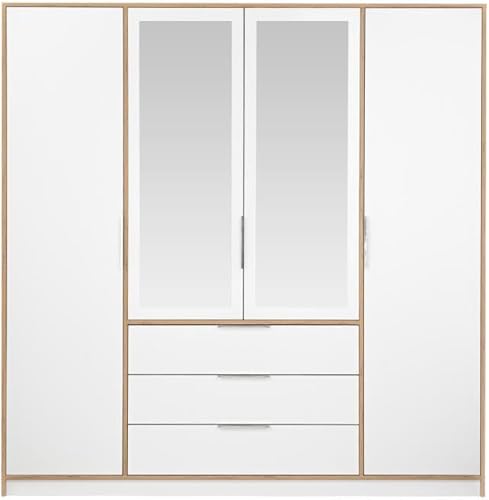Vente-unique - Armoire 4 Portes et 3 tiroirs - avec miroirs - L196 cm - Coloris : Naturel et Blanc - LAMIKI