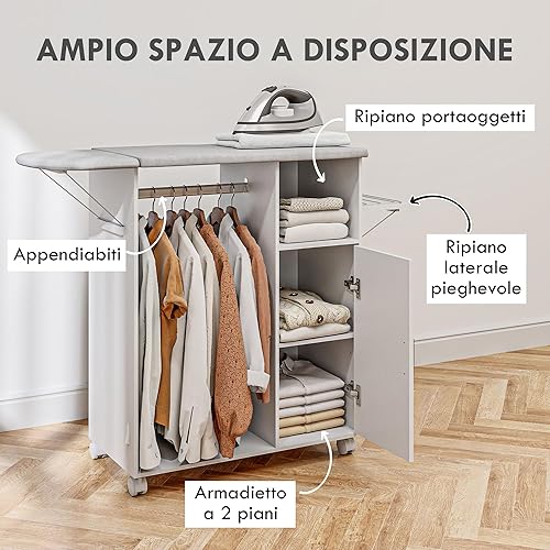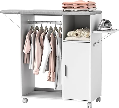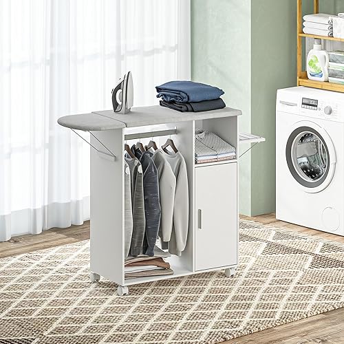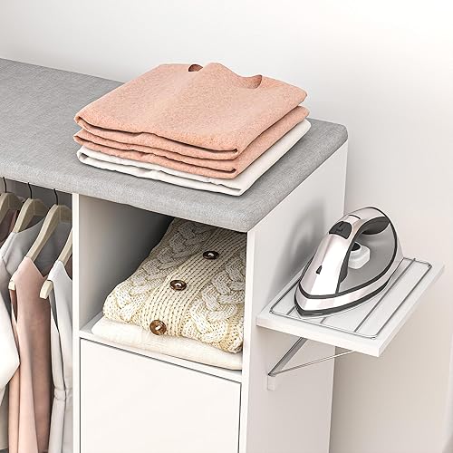 HOMCOM Armoire pour Table à Repasser en aggloméré et éponge avec étagère en Tissu Effet Lin, 3 étagères cubiques et Rail de Suspension, 127x42.5x99 cm, Blanc